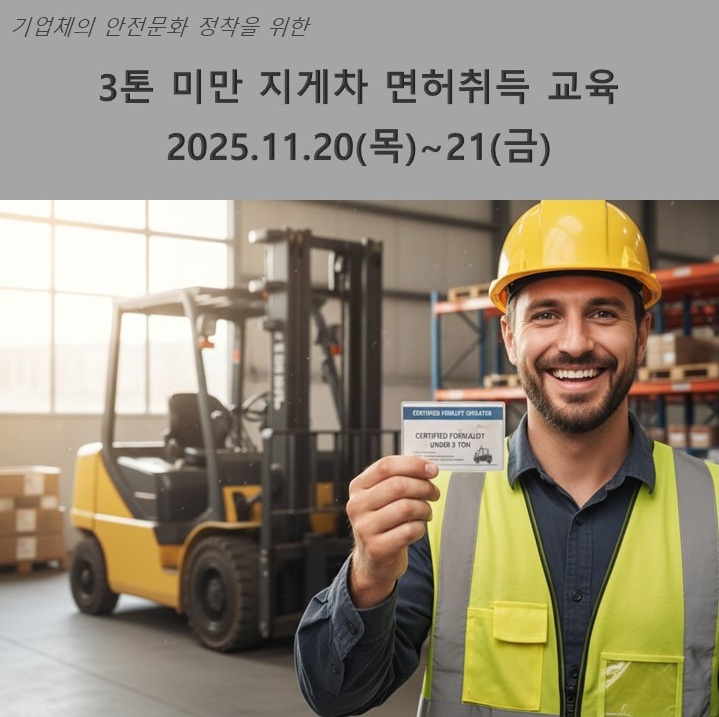 ■ 일시 : 2025.11.20(목)~21(금) 09:00~15:00(6시간, 2일간) ■ 대상 : 수원시 소재 기업 근로자 12명 ■ 내용 : 3톤 미만 지게차 면허 취득 교육(이론+실기) ■ 장소 : 수원현대중장비전문학원(수원시 권선구 매송고색로 762번지) ■ 교육비용 : 회원사 25만원, 비회원사 28만원(중식제공) - 입금안내 : 농협 351-1042-9028-13(수원현대중장비전문학원 박찬우) ■ 신청기한 : 11.7(금)까지 선착순 모집 ■ 신청방법 : 첨부 공문의 신청서, 사업자등록증 팩스(031-244-3477) 송부 ■ 문의처 : 031-244-3455(김자영과장) / 입금 및 세금계산서 : 031-238-2443(수원현대중장비전문학원)